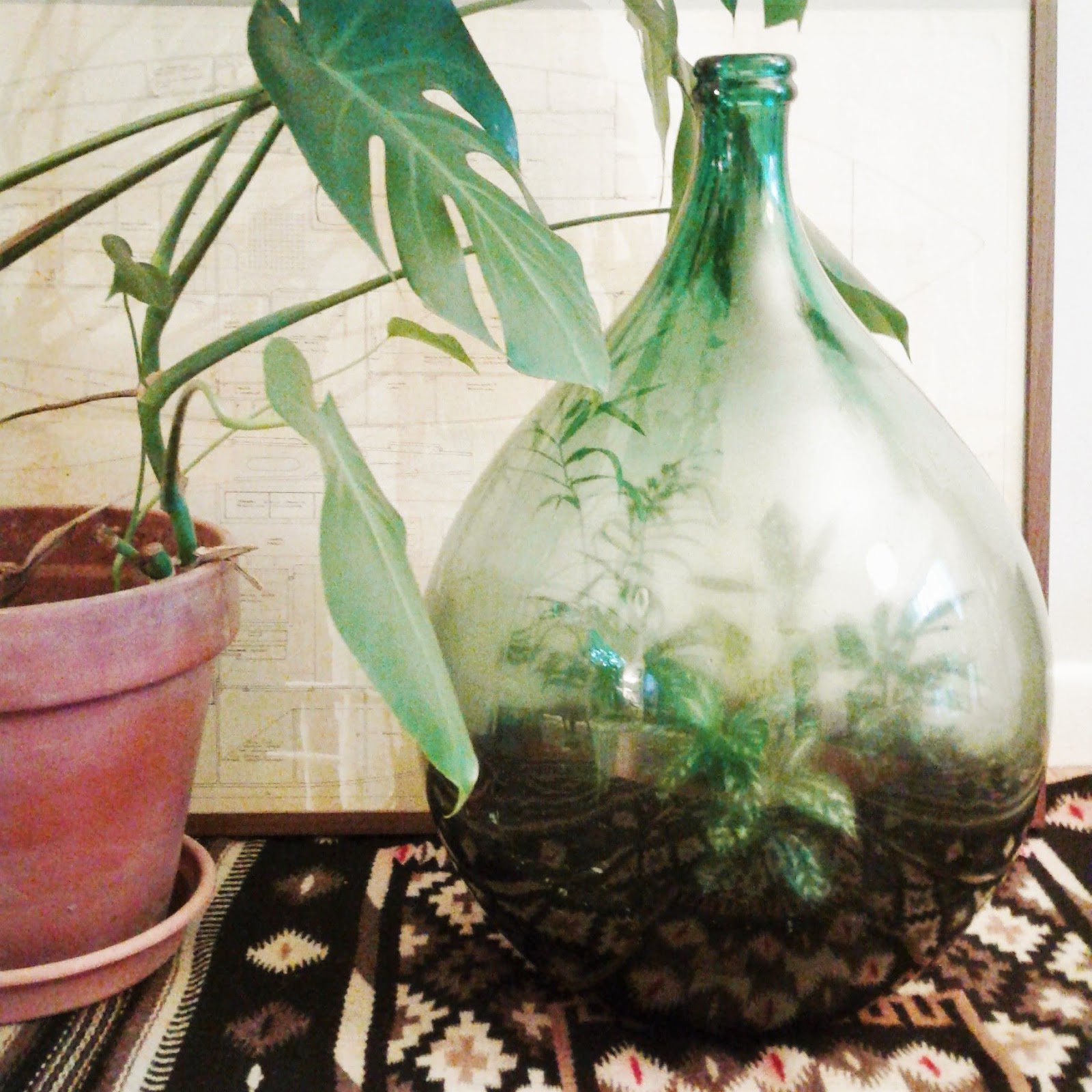 The point is when I got home, feeling totally dejected, I had a message in my in-box from a friend that included a photo of a terrarium her dad had made. This woman's uber-cool father used to make these authentic glass bottle terrariums in the 70s and 80s and sell them at craft shows. He stopped when plants inexplicably went out of style, but knowing how much I love plants, my friend wondered if I would like her dad to make me one.