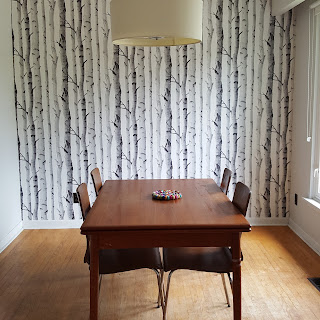 To my delight, Nobby wanted to consult with me about what color to paint the wall behind the fauxdenza. Now, may I reiterate that Nobby has great taste and really didn't need my advice, but it made me so happy that she asked. If it was my wall, I knew I would be wallpapering it, but Nobby was leaning toward paint. After sending a few color options her way, as well as encouraging her to put in the extra effort and go with wallpaper instead, I'm so excited that she and Rob decided to go with this iconic birch tree paper! I have long loved this design and wished I had a place for it in my own home, but the next best thing is getting to see it in a friend's home every time I visit.